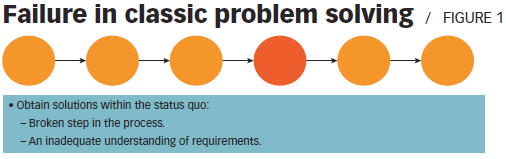 Traditional problem solving occurs in the left-brain analytical mode and tends to find solutions by addressing issues within status quo, for example, a broken step in the process, unclear requirements or a need to develop competencies (Figure 1). The innovator, on the other hand, looks for solutions outside the box.