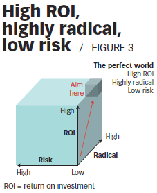 To address risk, we need data. Creative individuals may not always enjoy data collection, but it’s vital in managing risks.6 The data are probably going to be complex, but don’t lose sight of the end goal. You want the most radical new offering with the best return on investment at the lowest risk. Call it utopia, but that is where we aim. Figure 3 shows a 3-D risk tool representing this idea.7