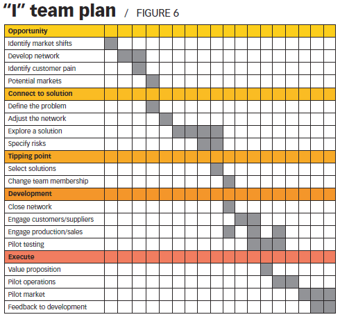 Conventional project management tools and techniques become critical here with stage gates, and frequent monitoring and review. Project management involves several tools, but a top choice is the Gantt chart (Figure 6). It also can be used in the creative phase but more loosely.